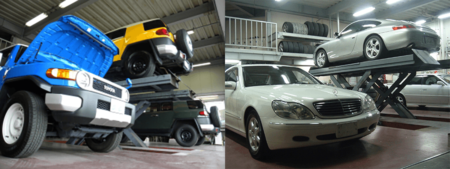 自社リフト付ピットを完備しております。車も丹念に磨き上げ、専門スタッフにより、内外装は勿論、リフトアップによる下回り点検など、細部に至るまで点検整備、仕上げ作業を行っております。