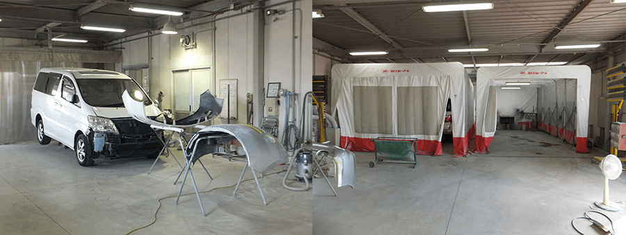 自社鈑金工場において、熟練した技術力と経験豊富なスタッフが修復をしております。また、工場内には専用塗装ブースを2機完備しており、塗装の焼き付けもしっかりとスピーディーに、綺麗に仕上げております。