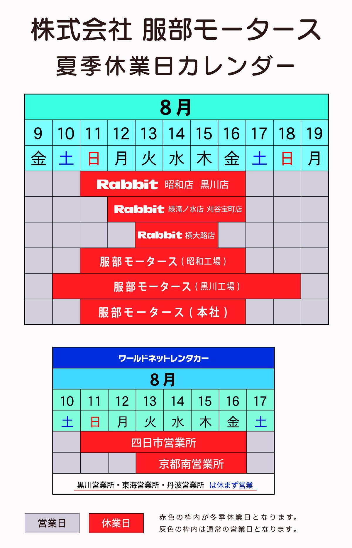 8月11日(日)〜8月16日(金) ㈱服部モータース(本社) ㈱服部モータース(昭和工場) ラビット昭和店 ラビット黒川店