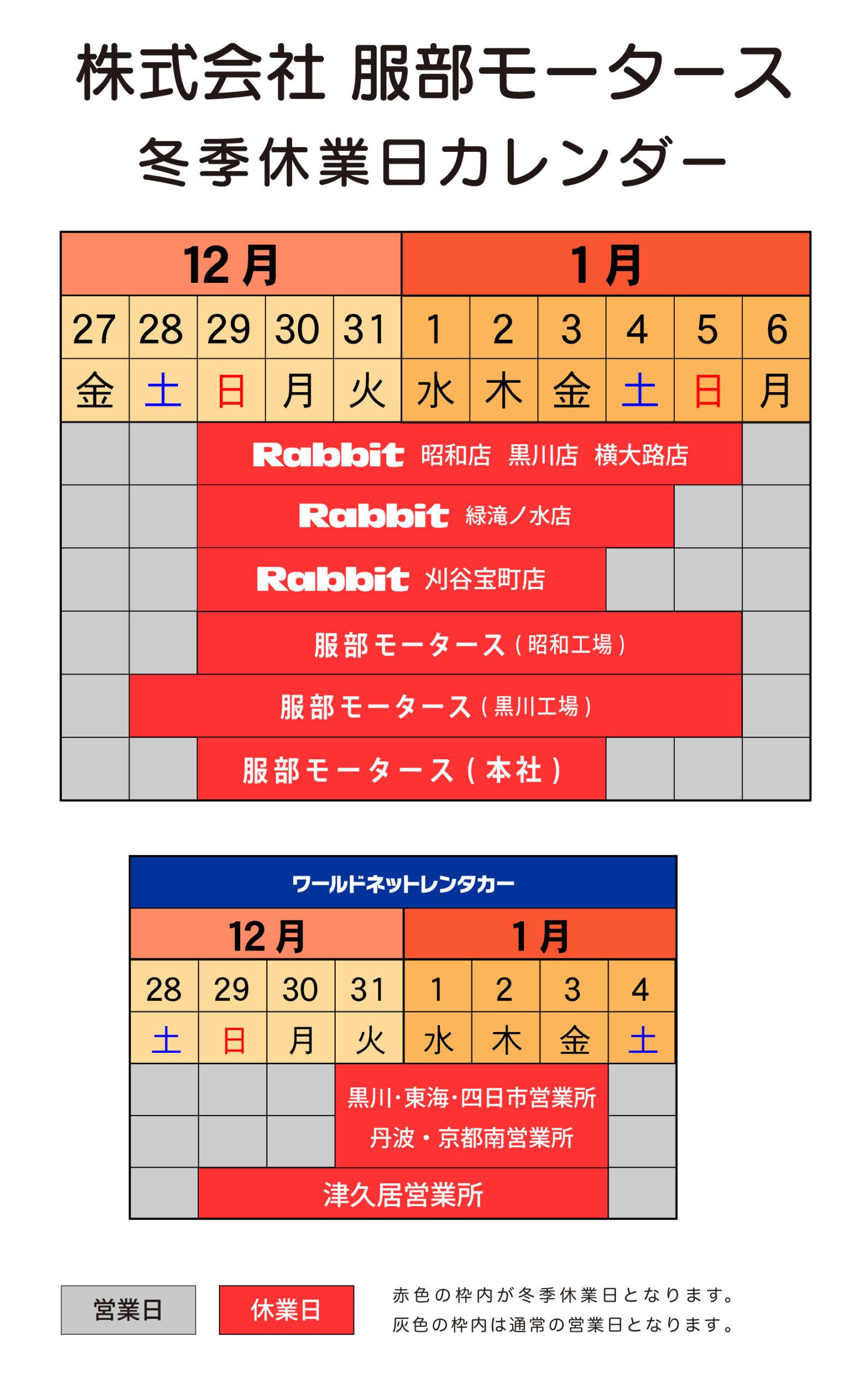 12月31日(火)〜1月3日(金) ワールドネットレンタカー黒川営業所 ワールドネットレンタカー東海営業所 ワールドネットレンタカー四日市営業所 ワールドネットレンタカー丹波営業所 ワールドネットレンタカー京都南営業所