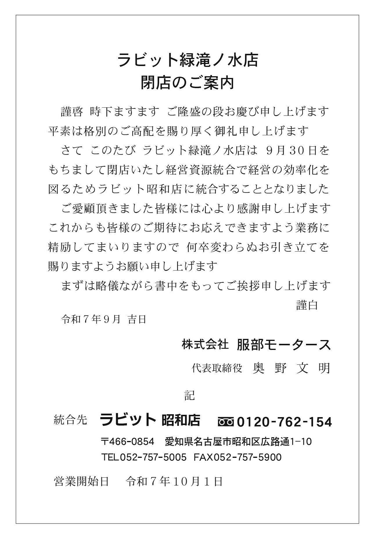 【ラビット緑滝ノ水店】閉店のご案内